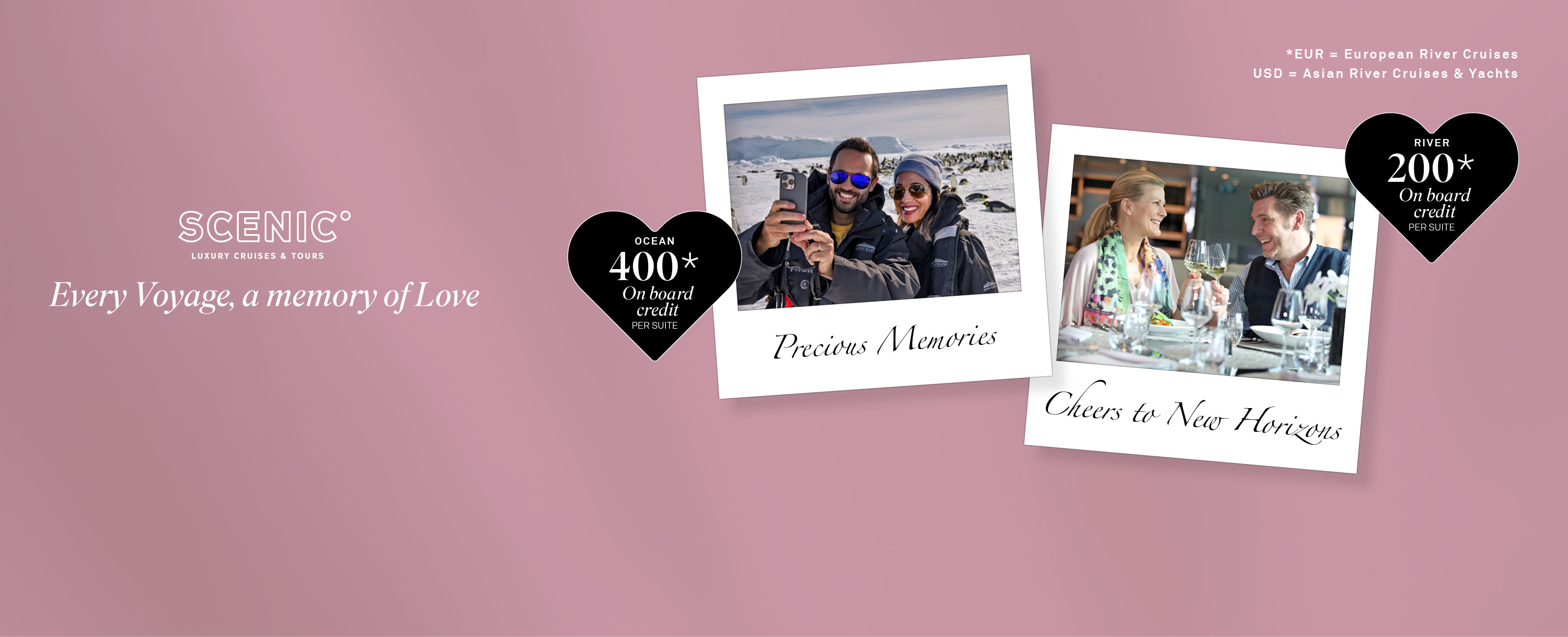 *EUR on European river cruises. USD on Southeast Asia river cruises and ocean cruises.
